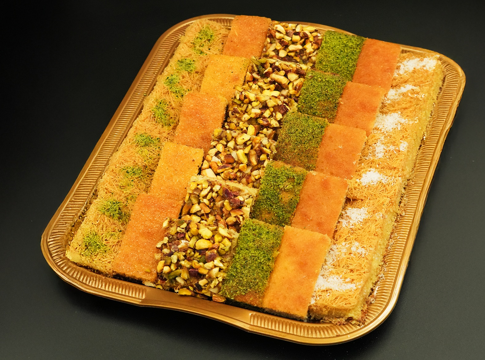 A mix of Basboosa with pistachio and Nutella flavors.