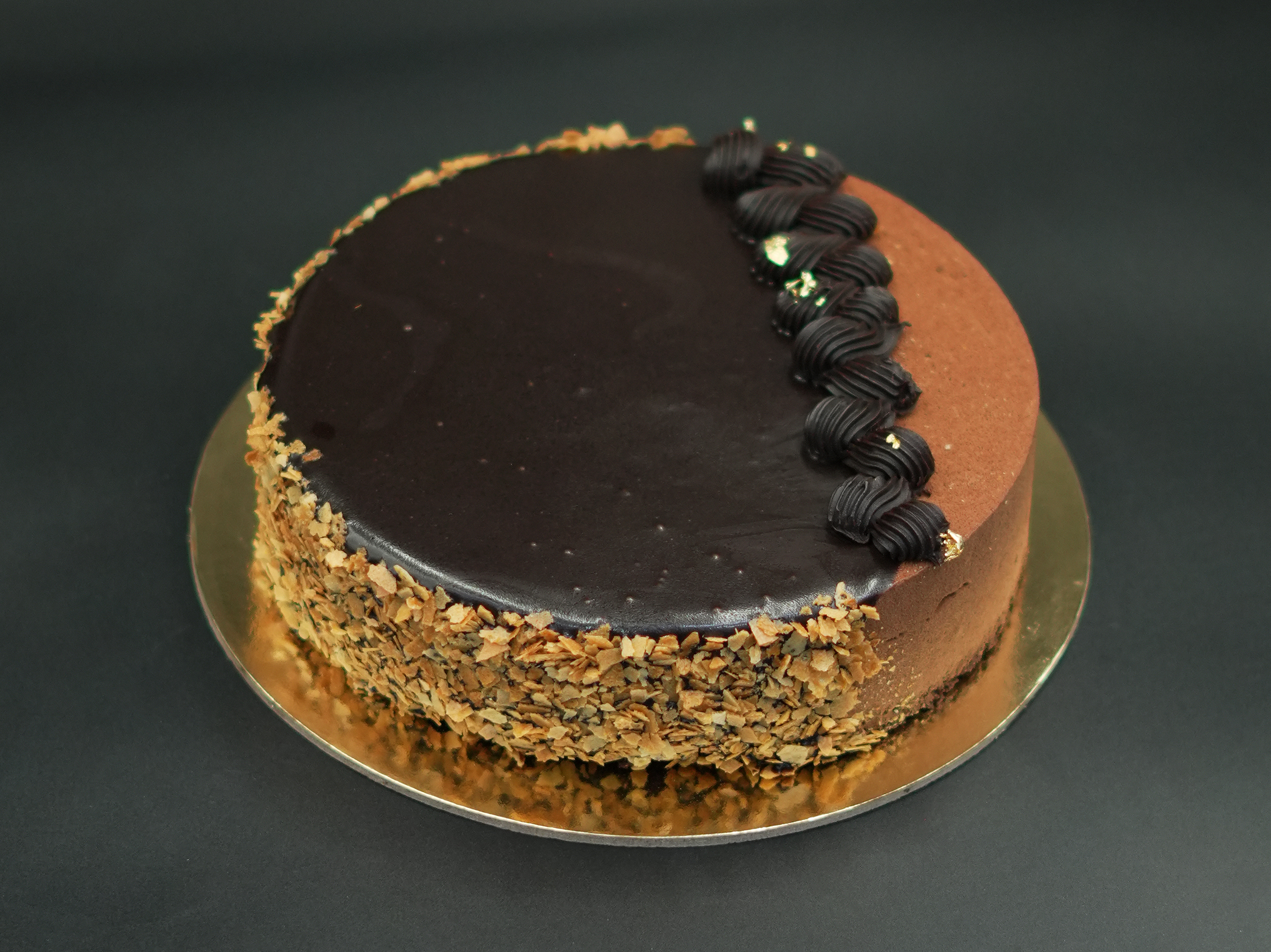 A cake with a rich chocolate flavor and a crunchy texture.